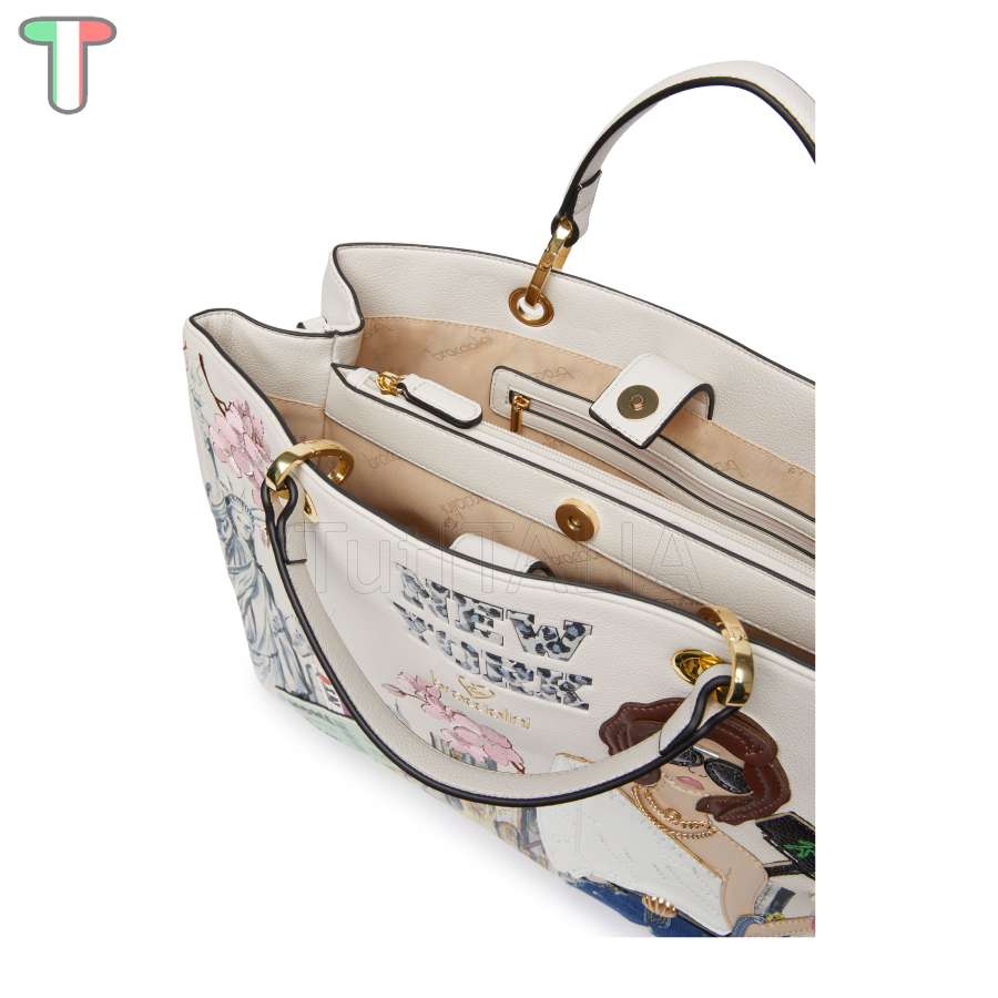 Kollektion 2025 FW.  Hersteller: Braccialini.  Linie: Cartoline.  Tua.  Funktionalität: Handtasche.  Material: Polisynt.  Farbe: multi.  Handgriff: doppelt mit abnehmbarem und verstellbarem Schultergurt.  Innenraum der Tasche: zwei interne Taschen, eine mit Reißverschluss und eine offene Tasche.  Gewicht: 38x24x13 cm.  Höhe des Griffs: 11 cm.  Maße: 0.8 kg.